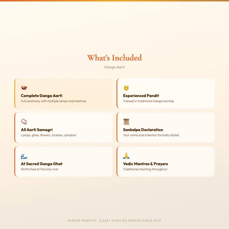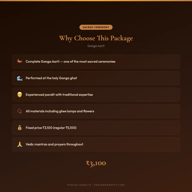 Ganga Aarti service includes the ceremony itself, which is led by a pandit and accompanied by devotional songs and chants. The ceremony usually takes place in the evening and involves the lighting of lamps, incense, and other offerings.