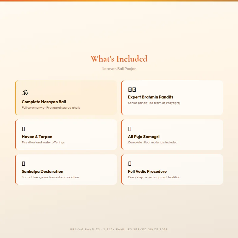 No. These are two distinct ceremonies with different purposes. Narayan Bali is specifically for souls who died unnatural deaths or whose last rites were incomplete. Tripindi Shradh is performed when three or more generations of ancestors have not received proper Shradh for an extended period. In some cases, both are recommended together, but they are separate rituals performed on separate occasions. Our pandit will help you understand which one your family’s situation calls for.