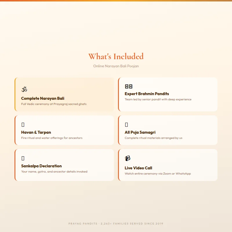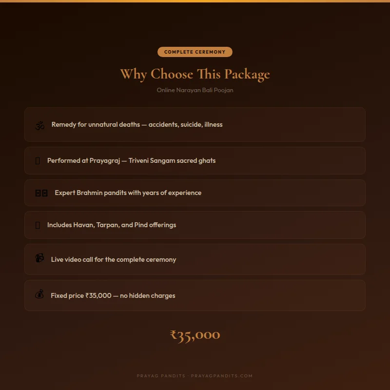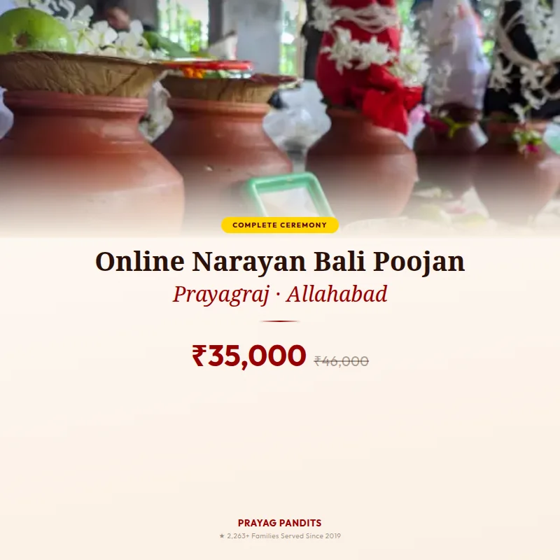 Our Online Narayan Bali Poojan service at Prayagraj allows your family to receive this complete ceremony through a live video call, available throughout the year — not limited to Pitrupaksha season alone.