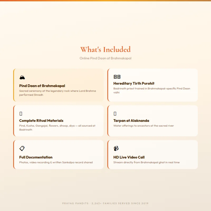 This is not a compromise. It is a thoughtfully arranged, fully authentic ceremony that honours both the ancient tradition and the practical realities facing modern families — especially those living abroad or in regions far from the Himalayas. Every step, every mantra, every offering is performed with complete ritual integrity at the actual Brahmakapal ghat.