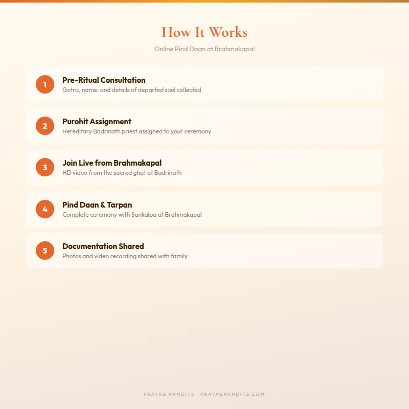 Understanding what happens on the day of the ritual helps families feel fully connected to the ceremony even from thousands of kilometres away. Here is how Online Pind Daan at Brahmakapal unfolds: