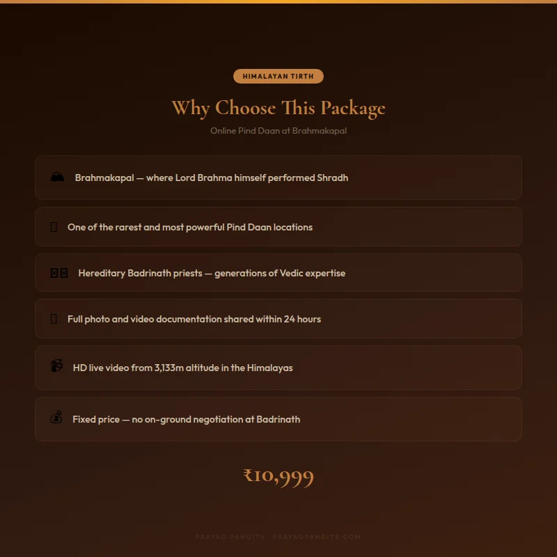 If you are planning to be physically present at Badrinath and wish to perform Pind Daan in person, please see our In-Person Pind Daan at Brahmakapal Badrinath package, which includes a Pandit, materials, and assistance on-site.
