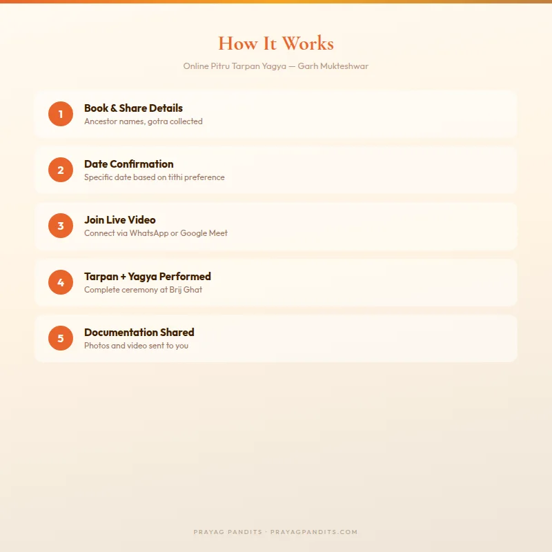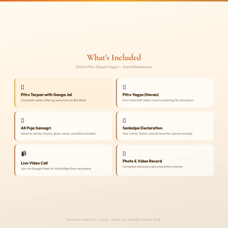 This product combines two complementary ancestral rituals into a single, comprehensive online ceremony: Pitru Tarpan and Yagya (Havan). Together they fulfil the twin obligations that our scriptures describe — water offerings that nourish the departed souls in their subtle plane, and fire offerings that purify and liberate them. The ceremony is conducted at Brij Ghat, Garh Mukteshwar, by our experienced pandits, and you participate live via a video call from wherever you are in the world.