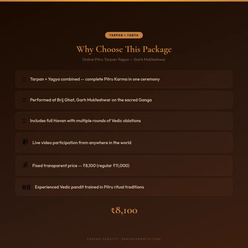 This combined Tarpan and Yagya package is appropriate for a wide range of situations. Families who have recently lost a member and wish to perform ongoing ancestral care beyond the initial Shraddha period will find this comprehensive. Those who were unable to perform Pitrupaksha rituals in any given year — due to travel constraints, work pressure, or family circumstances — can use this package to fulfill that obligation at another time, since the Ganga’s Teertha Shakti remains constant throughout the year.