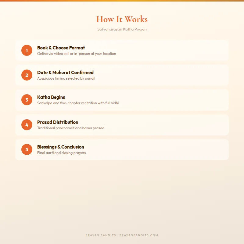 Create a Sacred Space: Prepare your home for the sacred ritual of Satyanarayan Katha Poojan by creating a serene and clean environment. Arrange the puja items, including the idol or image of Lord Satyanarayan, flowers, incense, and the sacred prasad. Set the stage for an immersive spiritual experience that will touch your heart and soul.