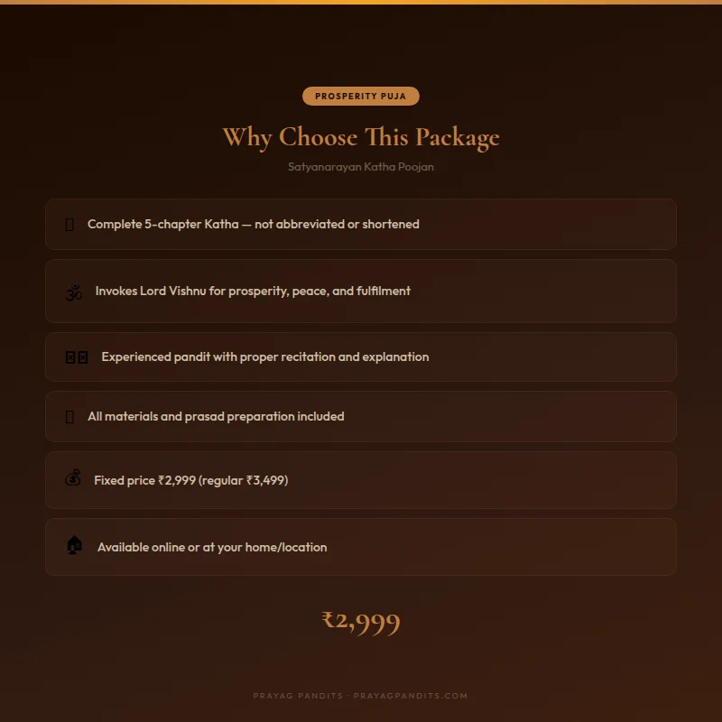 Abundance and Prosperity: Invite abundance and prosperity into your life with the Satyanarayan Katha Poojan. As you engage in the sacred ceremony, you align yourself with the universal flow of abundance and open doors to financial stability and success. The ritual acts as a catalyst for growth, paving the way for wealth and prosperity to manifest in all aspects of your life.