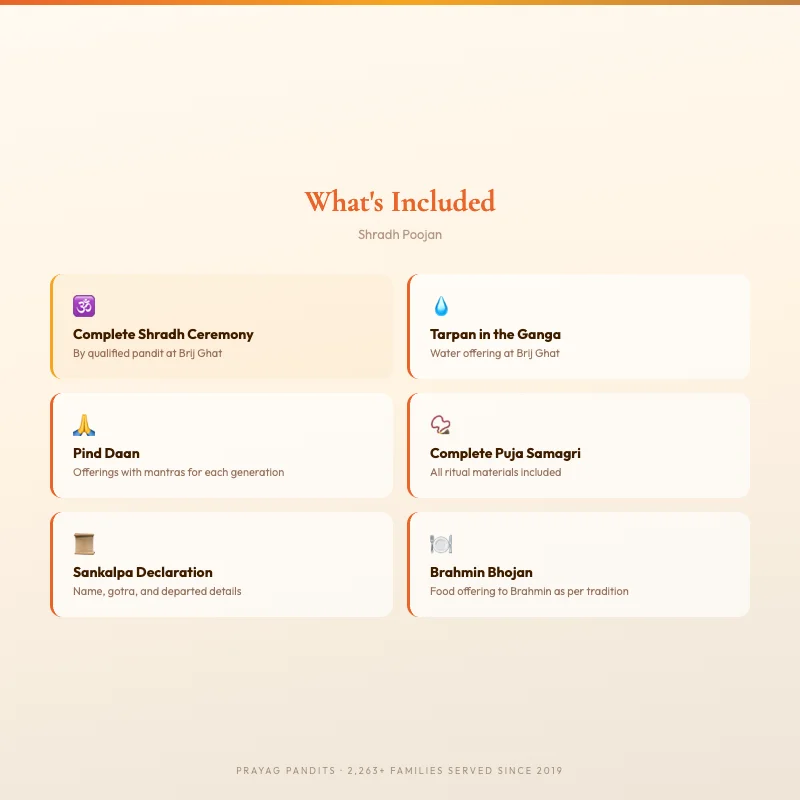 When you place your order, we will contact you within 24 hours to gather the necessary details: the name of the departed, their relationship to you, your gotra (lineage name), and your preferred date. If you are unsure of the gotra, our pandit will guide you — it is not an obstacle to proceeding with the ceremony.
