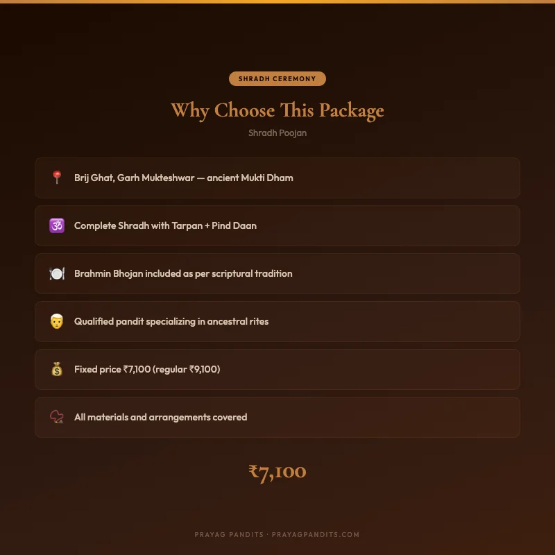 There is a moment in every family’s life when the heart turns toward those who came before — the ancestors whose love, sacrifice, and prayers shaped the world we live in. Shradh Poojan is that sacred moment, performed with full devotion on the banks of the holy Ganga at Garh Ganga, Garhmukteshwar. When you book this service with Prayag Pandits, a learned pandit performs the complete Shradh ceremony at Brij Ghat on your behalf, ensuring your pitrus receive the offerings, water, and prayers that tradition has carried forward for thousands of years.