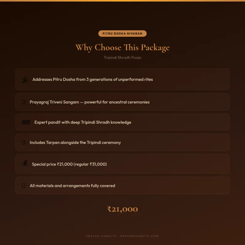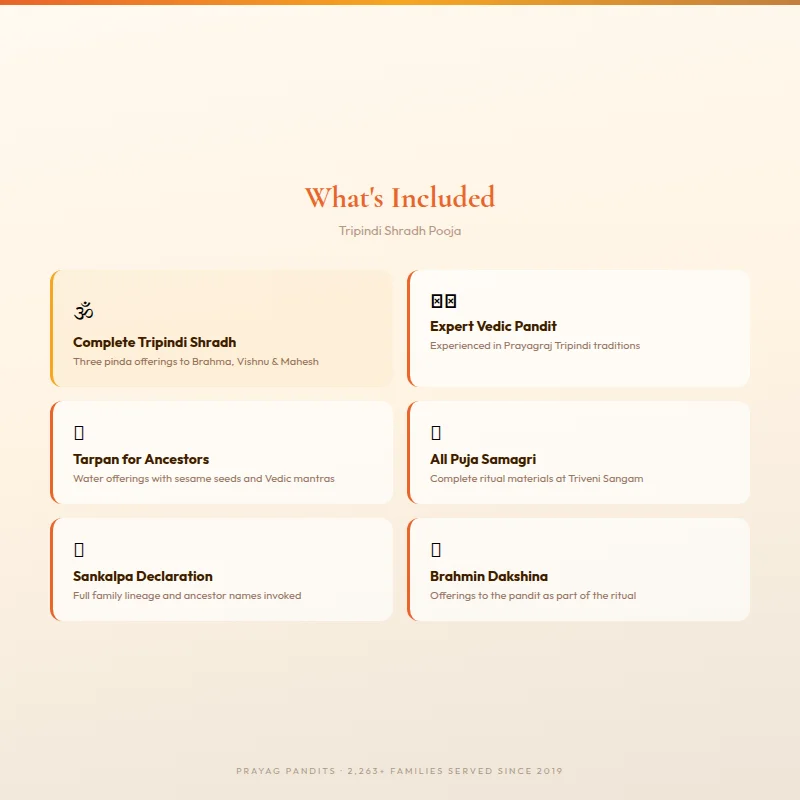 It is worth noting that Tripindi Shradh can be performed even if annual Shradh has not been missed — some families choose to perform it every few years as a proactive measure of ancestral care, particularly during Pitrupaksha at Prayagraj. For a complete understanding of the different types of Shradh and their specific applications, read our detailed guide here.